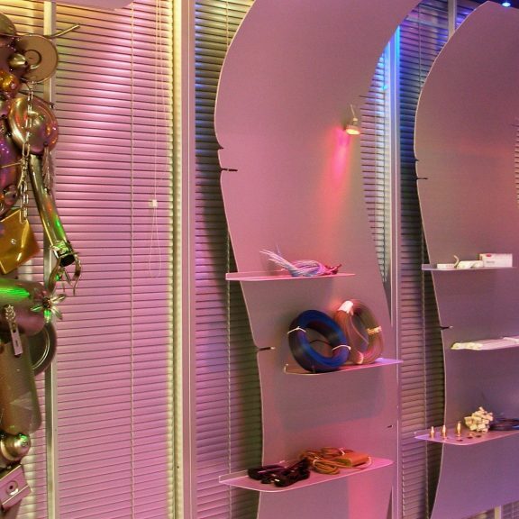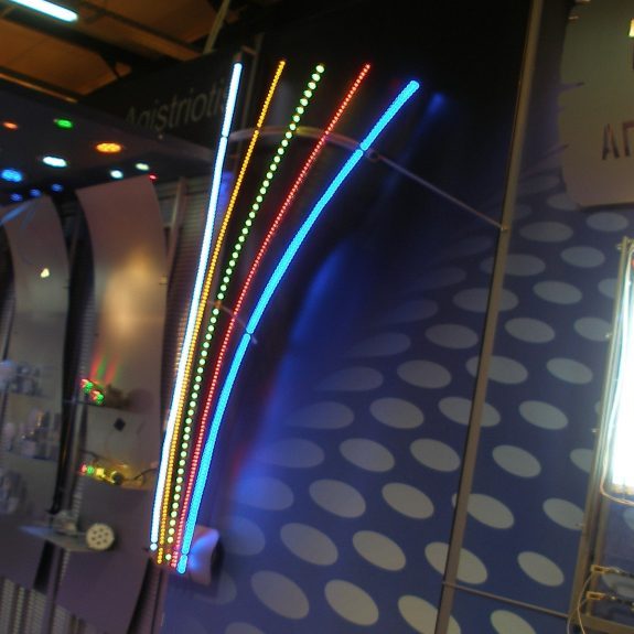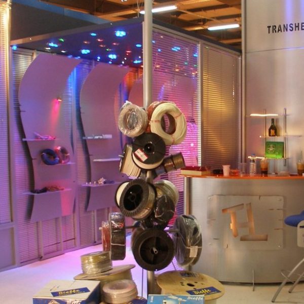 Μελετώντας την εταιρία Αγκιστριώτης ,αυτό που χρειαζόταν για μια ξεχωριστή εμφάνιση στην έκθεση ,ήταν ένα χώρο με χαμηλό φωτισμό που να φωτίζουν και να ξεχωρίζουν τα led φώτα όπως και τα φωτιστικά της εταιρίας. Το περίπτερο ήταν διπλής όψης ,οπότε κατά το σχεδιασμό του αποφασίσαμε να το χωρίσουμε σε δύο μέρη.Το πρώτο μέρος ήταν ένας διάδρομος με χαμηλό φωτισμό. Στο πάνω μέρος του διαδρόμου αυτού κρεμάσαμε ταβάνι ,το οποίο σχεδιάσαμε να δέχεται όλων των ειδών led φώτα οροφής, που προωθούσε και πουλούσε η εταιρία με τον καλύτερο τρόπο. Στο πλαϊνό μέρος του διαδρόμου υπάρχουν ειδικά σχεδιασμένες ραφιέρες για την προβολή λαμπτήρων και μια ειδική κατασκευή από λεντοταινίες της εταιρίας τοποθετημένες σε έναν όμορφο και εντυπωσιακό σχηματισμό. Στο τέλος του διαδρόμου υπήρχε ένα χώρος που προβάλλονταν τα φωτιστικά της εταιρίας ,είτε κρεμασμένα είτε σε ράφια.Το δεύτερο μέρους του περιπτέρου λειτουργεί ως υποδοχή των επισκεπτών και περιλαμβάνει μια μεταλλική reception, ραφιέρες για τα εξαρτήματα των φωτιστικών και μία κατασκευή που μοιάζει με ρομπότ, αποκλειστικά κατασκευασμένη από εξαρτήματα φωτιστικών της εταιρίας .Τα δύο μέρη αυτά χωρίζονταν με ένα διάτρητο διαχωριστικό που έδινε την δυνατότητα όμως να φαίνονται και τα δύο μέρη από όπου και να κοιτούσε ο επισκέπτης.
