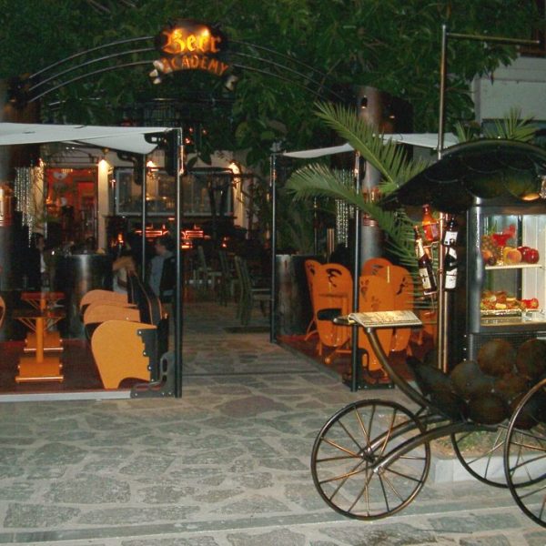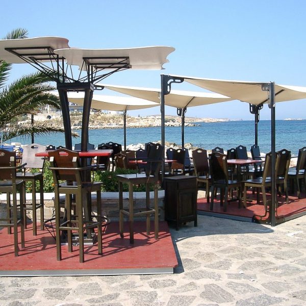 Στον εξωτερικό χώρο σχεδιάσαμε ειδικές κατασκευές με ξύλινο υπερυψωμένο πάτωμα, μεταλλική δομή και τριγωνικά καραβόπανα για τη προστασία από τον ήλιο. Τοποθετήσαμε coupe, καθιστικά με μαύρη και πορτοκαλί κουρμπαριστή πλάτη.