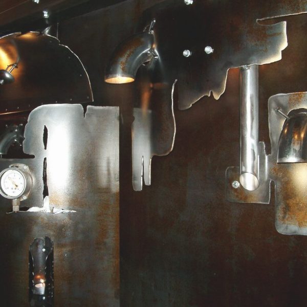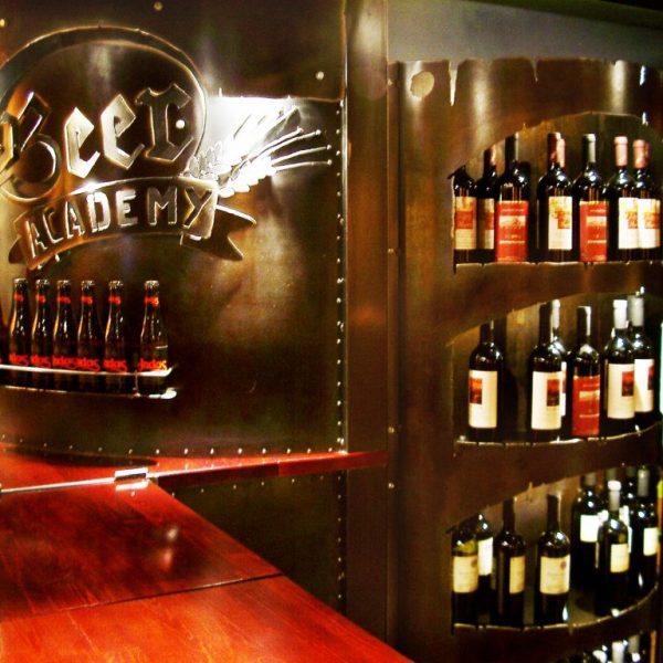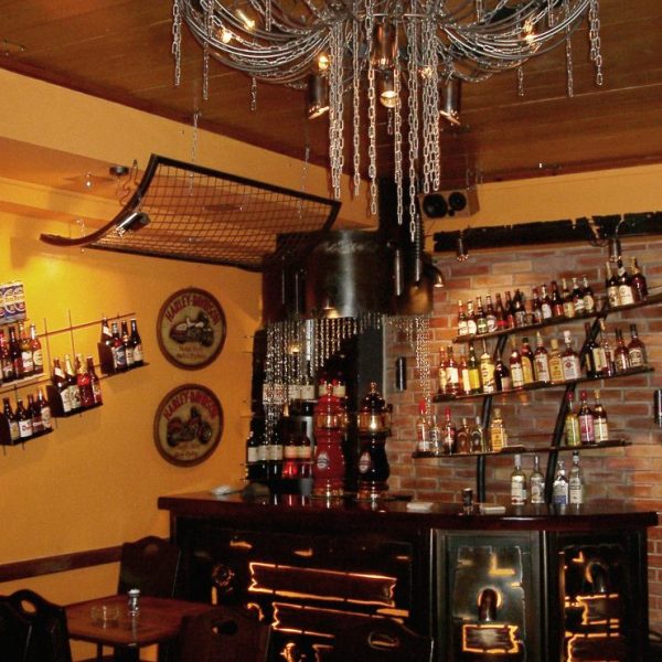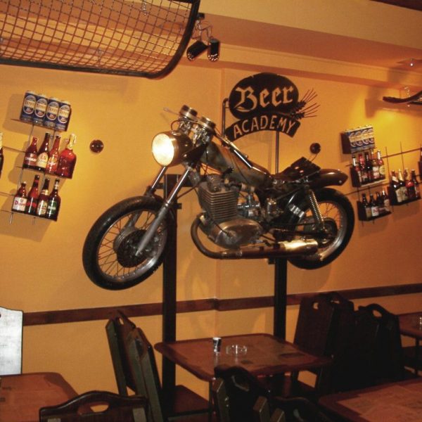 Το εσωτερικό διπλό μπαρ με φωτιζόμενη όψη σχηματίζει ένα ενιαίο συνεχόμενο πάσο εξυπηρέτησης. Μαύρη λαμαρίνα 4χιλ χρησιμοποιήθηκε για το μεταλλικό πάνελ που χωρίζει την κουζίνα και το παρασκευαστήριο από τον χώρο των καθιστικών με ενσωματωμένη ραφιέρα για τις φιάλες της μπύρας. Στο βάθος προσκαλούνται ιδιαίτερα οι λάτρεις της μοτοσυκλέτας να γευτούν τις ετικέτες μπύρας στο ζεστό και φιλικό περιβάλλον.