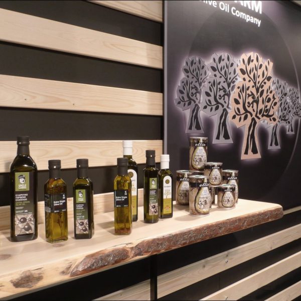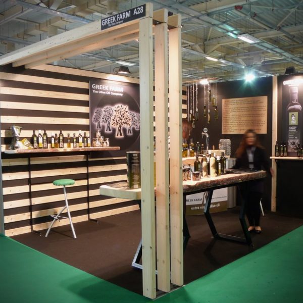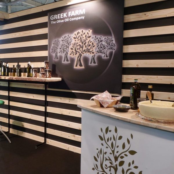 Για το περίπτερο της Greek Farm , μία ελληνική εταιρία παραγωγής ελαιόλαδου , στην έκθεση FoodExpo 2015 , επιλέξαμε σε συνεργασία με την εταιρία ως βασικό θέμα ένα περιβάλλον που να αναδεικνύει το φυσικό και παρθένο προϊόν. Επιλέξαμε ως βασικό υλικό το ξύλο και το μαύρο σαν χρώμα για τη δημιουργία οπτικής αντίθεσης . Τα εκθετήρια , η ρεσεψιόν και τα ράφια είναι κατασκευασμένα χειροποίητα από μασίφ ξύλο και μέταλλο και δίνουν ένα πιο επιβλητικό και φυσικό φόντο στο περίπτερο. Τα γραφικά επιμελήθηκε εξολοκλήρου η ομάδα μας δίνοντας και κάτι καινούριο στην ταυτότητα και προσωπικότητα της εταιρίας .
