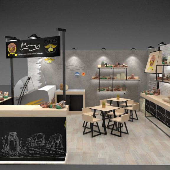 Η ομάδα της Art & Design Group σχεδίασε και κατασκεύασε το εκθεσιακό τους περίπτερο αναδεικνύοντας τα αγνά κρητικά προϊόντα μέσα από σύγχρονο σχεδιασμό και ειδικά διαμορφωμένο εξοπλισμό σύμφωνα με τις απαιτήσεις του πελάτη. Στη δομή αποτυπώσαμε το παραδοσιακό στοιχείο με το λευκό τουβλάκι και την πατητή τσιμεντοκονία ενώ η λευκή μασίφ ξύλινοι πάγκοι συνδυάστηκαν με τις chalk paint παραστάσεις της κρητικής γης και των τοπικών προϊόντων της. Επιμεληθήκαμε επίσης των φωτισμό τα λογότυπα και τα γραφικά των εταιριών.