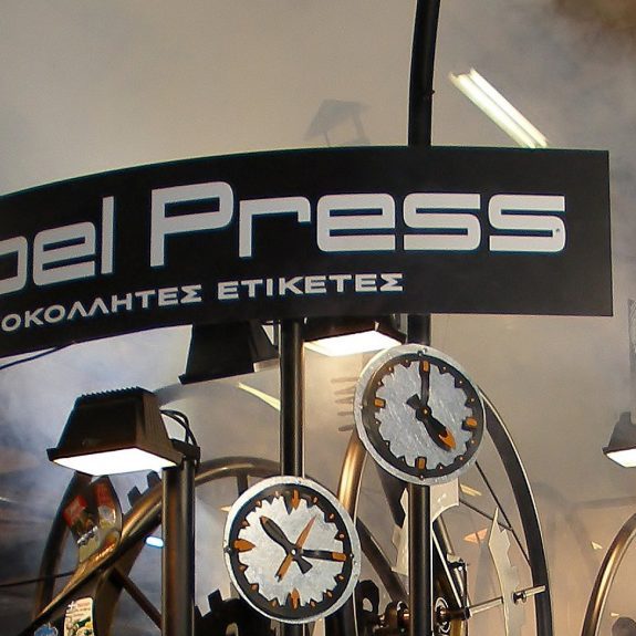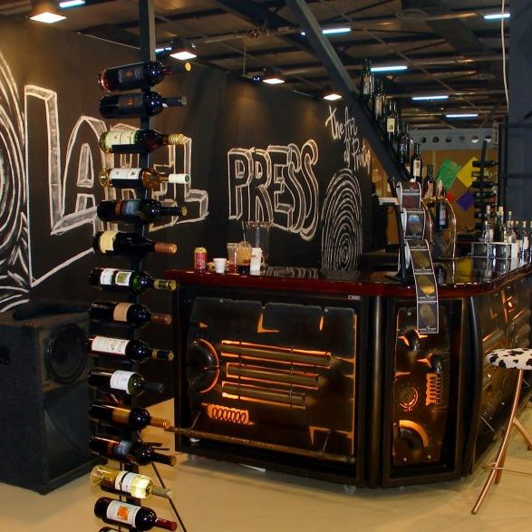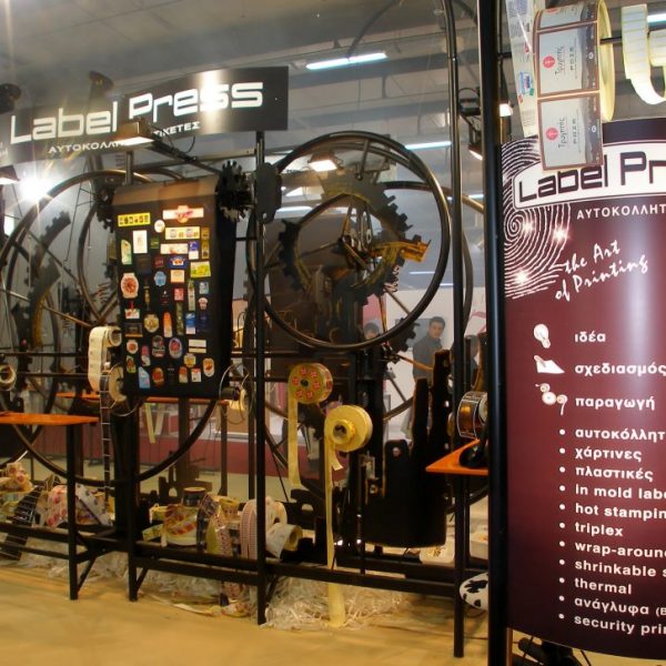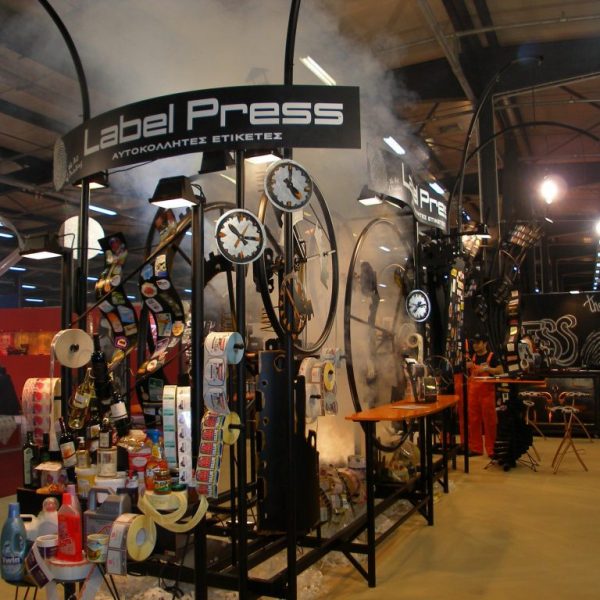 Στο εκθεσιακό περίπτερο της εταιρίας Label Press αποτυπώνεται η δυνατότητα της Art & Design Group να σχεδιάζει μοναδικές κατασκευές, με τις προδιαγραφές που καθορίστηκαν από τον πελάτη σε συνδυασμό με τις ιδέες της σχεδιαστικής μας ομάδας και την τεχνογνωσία των έμπειρων τεχνικών μας. Στόχος μας, ήταν να αναπαραστήσουμε τη διαδικασία με την οποία το χαρτί επεξεργάζεται μέχρι την τελική μορφή την ετικετών που παράγει η εταιρεία. Το στυλ και η αίσθηση που δόθηκε στο χώρο ήταν καθαρά Βιομηχανική -industrial style . Τα Stand που υπάρχουν στο περίπτερο, διέθεταν δείγματα και λογότυπα των πελατών του και τις ποικίλες προτάσεις τους . Το σκηνικό του περιπτέρου ολοκληρώνεται με το bar στο βάθος ,όπου και υποδέχεται τους επισκέπτες και τους προσκαλεί ,με ένα κέρασμα ,σε μια συζήτηση .