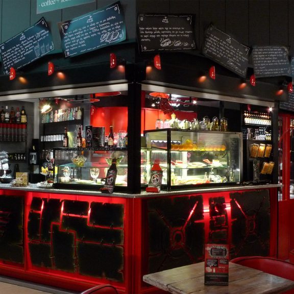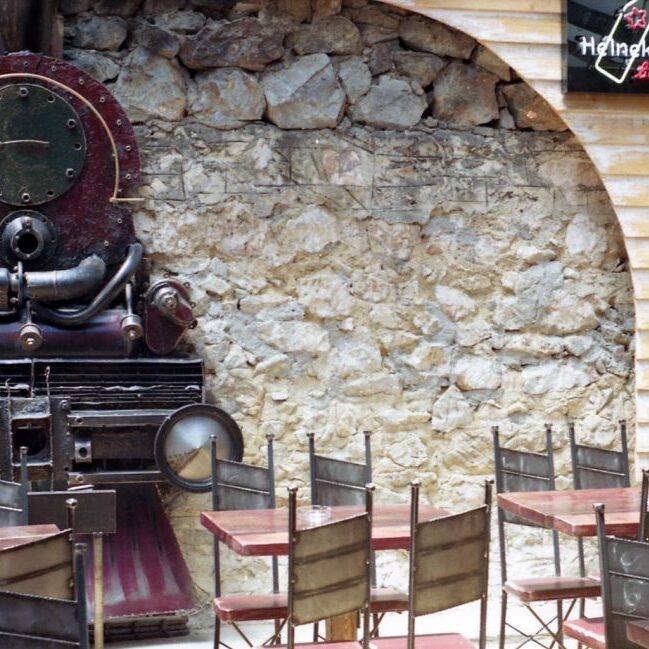 Τόσο η χρήση του ελαφρά επεξεργασμένου ανοιχτόχρωμου ξύλου όσο και η χρήση ταπετσαρίας εφημερίδων του 1912-1960 αποτελούν τα κυριότερα στοιχεία στη διακόσμηση του. Στο μπαρ, ενοποιείται οπτικά ο χώρος των επισκεπτών με την κουζίνα, και θεαματικές κινήσεις των μαγείρων με φωτιές και άλλα τεχνάσματα συμπληρώνουν την σκηνικότητα που προσδίδεται στο σημείο. Στο μπαρ χρησιμοποιήθηκαν χαλύβδινες επιφάνειες 6χιλ πάχους κομμένες με σχέδια αφήνοντας τον εσωτερικό φωτισμό να τονίζει την ταπετσαρία από τις εφημερίδες. Ανοιχτόχρωμοι τοίχοι σε όλο τον χώρο λούζονται με γλυκό ατμοσφαιρικό φωτισμό και προσδίδουν ένα ενιαίο οπτικό αποτέλεσμα Στο τοίχο στο πλάι του μπαρ δεσπόζει ένα ρολόι με κινούμενα γρανάζια. Κατασκευάσαμε ακόμη δύο μεγάλες μεταλλικές αψίδες ως στέγαστρα στην πρόσοψη του εστιατορίου.