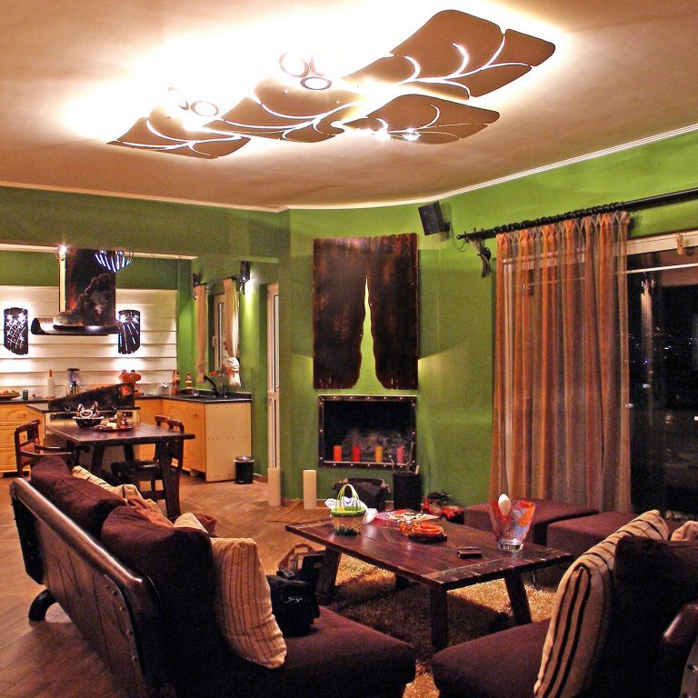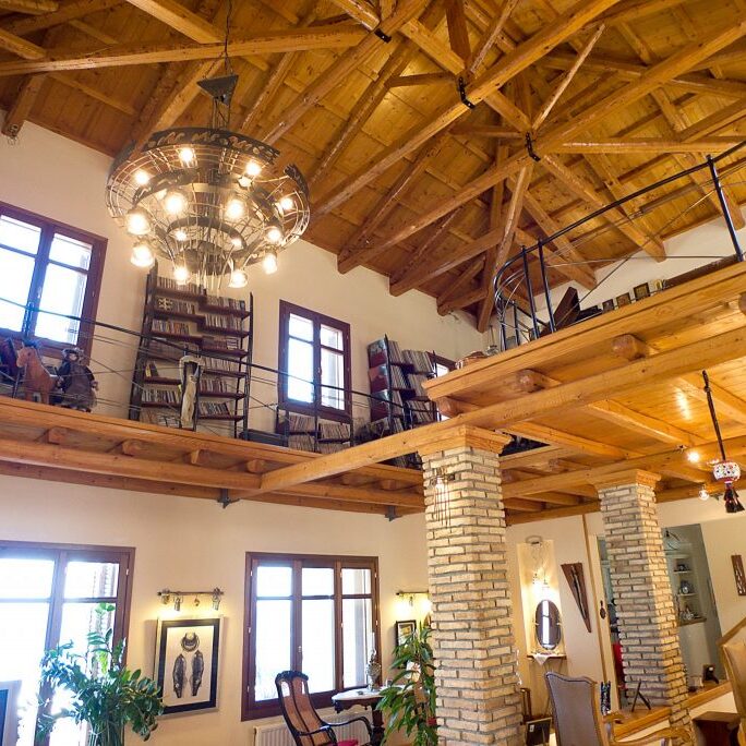Στην εσωτερική διακόσμηση συνδυάζονται αυθεντικά κομμάτια επίπλων με μασίφ σκούρο ξύλο, αντίκες και καλής ποιότητας μοντέρνα έπιπλα, τα οποία τοποθετήθηκαν με τέτοιο τρόπο ώστε να δίνουν την αίσθηση της ευρυχωρίας στο living room και στο χώρο του πιάνου., Έπιπλα, ταπετσαρίες, υφάσματα επιπλώσεων, κουρτίνες και χειροποίητα χαλιά σχεδιάστηκαν προσεκτικά μέχρι την παραμικρή λεπτομέρεια και προσδίδουν πολύχρωμη και ευχάριστη ατμόσφαιρα. Τα εξαιρετικής ποιότητας δρύινα έπιπλα της τραπεζαρίας, με τα διακοσμητικά μοτίβα και τον κεντρικό πολυέλαιο χάρισαν ζεστή ατμόσφαιρα στο σπίτι.