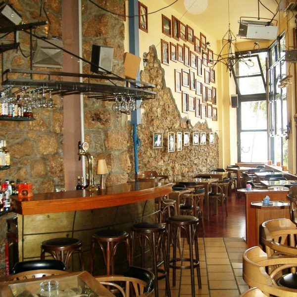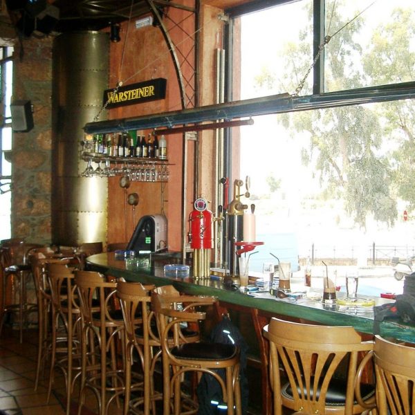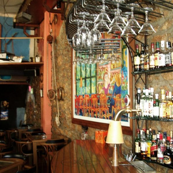 Με την επιβλητική μεταλλική κατασκευή στο πίσω μέρος του μπαρ παραπέμπει στην πλώρη ενός πλοίου και διαχωρίζει τον χώρο της κουζίνας. Ο χώρος ύστερα από την ανακαίνιση εκπνέει φιλοξενία και ζεστασιά είτε από την μόνιμη έκθεση φωτογραφιών των ιδιοκτητών στις μεταλλικές χειροποίητες κορνίζες στον μπροστινό τμήμα του χώρου είτε από τα διακοσμητικά στοιχεία από όλο τον κόσμο που φιλοξένησε ο χώρος θέλοντας να σε ταξιδέψει. Ακόμη κολλάζ από ναυτικούς χάρτες διαμορφώνουν την ταπετσαρία στην οροφή. Στο μασίφ ξύλινο μπαρ από έβενο περιλαμβάνεται ένθετο τριγωνικό ψυγείο για τα κρασιά. Η ραφιέρα με τα ποτά προκειμένου να διακρίνεται από το εξωτερικό παίρνει την θέση μπροστά στο παράθυρο που ανοίγεται προς τα πάνω με αντίβαρο. Στο υπόγειο η διακόσμηση παραπέμπει σε κότερο του 1950 και αξιοποιείται ως χώρος περιοδικών εκθέσεων.