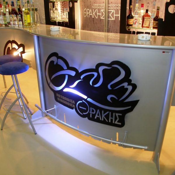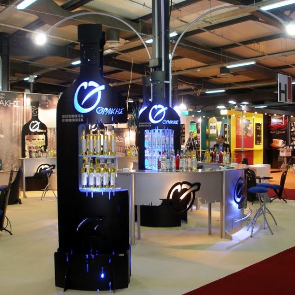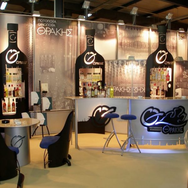 Το εκθεσιακό περίπτερο της εταιρίας: «Ποτοποιία- Οινοποιία Θράκης Α.Β.Ε.Ε» , Σχεδιάστηκε με έμπνευση το μπουκάλι της εταιρίας . Περιλαμβάνει κεντρικό Bar, ένα μικρό σαλονάκι και μεταλλικές ραφιέρες με τη μορφή μπουκαλιών με ανάγλυφο το λογότυπο της εταιρίας. Οι μεταλλικές ραφιέρες διαθέτουν ρυθμιζόμενα γυάλινα ράφια που βρίσκονται στο εσωτερικό μέρος του κουτιού και ο φωτισμός των μπουκαλιών γίνεται με μπλε νέον φως. Στο Bar αναγράφεται η επωνυμία της εταιρίας που είναι κατασκευασμένη εξολοκλήρου με μεταλλικά πλαίσια. Ο συνδυασμός των υλικών και το φινίρισμα με το φωτισμό και την απεικόνιση των γραφικών δημιουργεί μια αίσθηση πολυτέλειας.