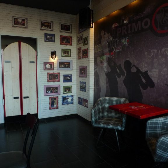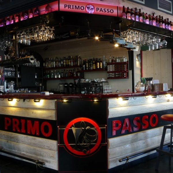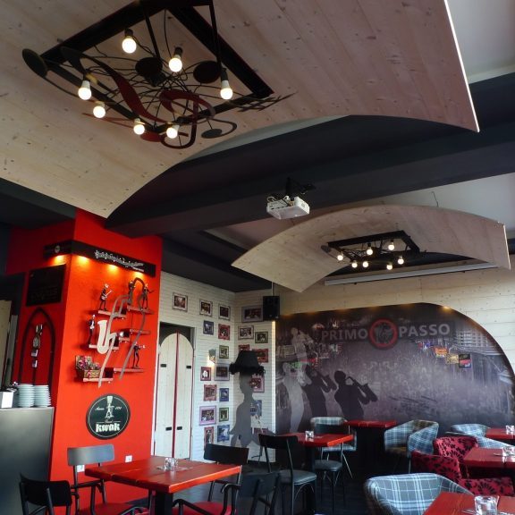 Η ιδέα μας ήταν να δημιουργήσουμε ένα μουσικό Τζαζ Bar-Cafe σε στυλ Παμπ Νέας Ορλεάνης ,την πρωτεύουσα της τζαζ. Μελετημένη και σχεδιασμένη εξολοκλήρου από την ομάδα μας η ανακαίνιση έδωσε έμφαση στο κεντρικό σημείο του χώρου όπου δεσπόζει ο ξύλινος τοίχος με κρυφό φωτισμό σε συνδυασμό με τη πρωτότυπη ταπετσαρία με μουσικές σκηνές από δρόμους της Νέας Ορλεάνης .Στο ίδιο τοίχο έχει τοποθετηθεί οθόνη και προτζέκτορας για τη προβολή διάφορων μουσικοχορευτικών αλλά και αθλητικών γεγονότων. Συνδυαστικά με το μουσικό θέμα του μαγαζιού κατασκευάσαμε ραφιέρα από μασίφ ξύλο και χάλυβα που όμορφα πάνω της σχηματίζεται περίτεχνα μία μορφή σαξοφωνίστα . Συνθέσαμε για τα φωτιστικά του χώρου τις ξύλινες, καμπύλες κατασκευές της οροφής,που δημιουργούν ένα ωραίο φόντο με τις μεταλλικές νότες. Το μπαρ έχει κατασκευαστεί από μασίφ ξύλο ελάτου ενώ μεταλλικά στοιχεία σχηματίζουν ανάγλυφα το λογότυπο του Primo Passo . Μεταλλικές χειροποίητες ποτηριέρες με κρυφό φωτισμό κρέμονται στο πάνω μέρος του μπαρ μαζί με την κάνουλα της Draft μπύρας. Στον πίσω χώρο του μπαρ,ο τοίχος έχει επενδυθεί με ξύλο και έχουν τοποθετηθεί ξύλινα ράφια για τα ποτά. Η διακοσμητική μας παρέμβασή έγινε και στα WC του Primo Passo , με ανοξείδωτους νιπτήρες που ενσωματώθηκαν στον μασίφ ξύλινο πάγκο. Τέλος για να ξεφύγουμε από το μονότονο στυλ της τζαμαρίας δημιουργήσαμε αυτοκόλλητα σε σχήμα αναγεννησιακού παραθύρου , τα οποία συνδυάσαμε με την κατασκευή της διπλής πόρτας της εισόδου.Το κόκκινο χρώμα κυριαρχεί στο χώρο, από τα ξύλινα μασίφ τραπεζάκια μέχρι τους τοίχους που ήταν και προσωπική επιλογή του ιδιοκτήτη.
