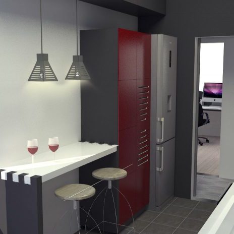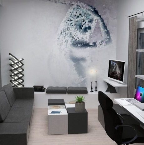 Η μελέτη του χώρου επικεντρώθηκε στη αυξανόμενη τάση που συνδυάζει καθιστικό, τραπεζαρία, γραφείο σε ενιαίο χώρο καθημερινής χρήσης. Η κεντρική ιδέα για την κατασκευή των επίπλων δημιουργήθηκε μέσα από τα σχήματα του παιχνιδιού τρίλιζα, το οποίο είναι εμφανές στα ράφια της βιβλιοθήκης, στα μεταλλικά πόδια του γραφείου, όπως και στο έπιπλο της τηλεόρασης. Στον ένα τοίχο δημιουργείται μία σύνθεση από κάδρα σε απαλούς τόνους, ενώ στον άλλο μία μορφή εμπνευσμένη από ηλεκτρονικά παιχνίδια και χαρακτήρες anime. Στην κουζίνα πινελιές κόκκινου χρώματος προσδίδουν στο χώρο νεανικό χαρακτήρα και έντονες αντιθέσεις .Το χαρακτηριστικό σχήμα της κλεψύδρας δημιουργείται στον κόκκινο τοίχο, από σανίδες μασίφ ξύλου.