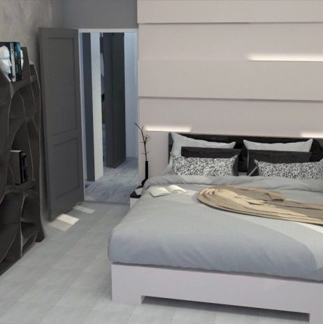 Στο χώρο του υπνοδωματίου τα χρώματα είναι σε τόνους του γκρι και του μπεζ, με έντονο στοιχείο την μεταλλική βιβλιοθήκη και τον καθρέφτη από φυσικό ξύλο, ενώ η ανάγλυφη επιφάνεια που βρίσκεται στο πίσω μέρος του κρεβατιού τονίζεται με led φωτιστικά, δίνοντας αίσθηση χαλάρωσης και θετικής ενέργειας.
